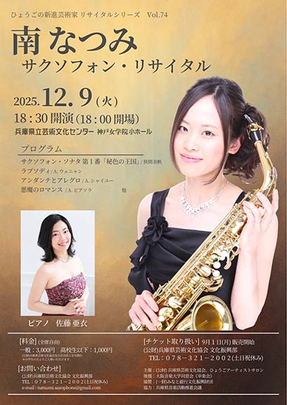ひょうごの新進芸術家リサイタルシリーズ Vol.74 南なつみ サクソフォン・リサイタル 開始: 2025年 12月 9日 6:30 PM 会場: 兵庫県立芸術文化センター 神戸女学院小ホール カテゴリ: 後援演奏会 入場料: 一般:3,000円 高校生以下:1,000円 お問い合わせ: 078-321-2002(土日祝休み) 開場18:00 開演18:30 会場 兵庫県立芸術文化センター 神戸女学院小ホール 〒663-8204兵庫県西宮市高松町2-22 https://www1.gcenter-hyogo.jp https://www1.gcenter-hyogo.jp/access/