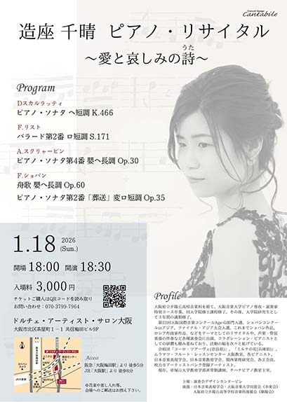 造座千晴 ピアノ・リサイタル 開始: 2026年 1月 18日 6:30 PM 会場: ドルチェ・アーティスト・サロン カテゴリ: 後援演奏会 入場料: 入場料3,000円 お問い合わせ: 070-3799-7964 開場18:00 開演18:30 会場 ドルチェ・アーティスト・サロン大阪 大阪市北区茶屋町1-1 共信梅田ビル9F https://www.dolce.co.jp/salon/osaka/ https://www.dolce.co.jp/store/osaka/#access