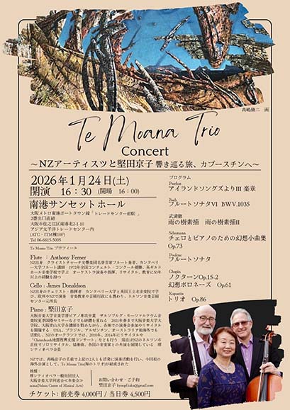 Te Moana Trio Concert 〜NZアーティスツと堅田京子 響き巡る旅、カプースチンへ〜 開始: 2026年 1月 24日 4:30 PM 会場: 南港サンセットホール カテゴリ: 後援演奏会 入場料: 前売券 4,000円/当日券4,500円 開場16:00 開演16:30 会場 南港サンセットホール 大阪市住之江区南港北2-1-10 アジア太平洋トレードセンター内 お問い合わせ kyoupf.taka@gmail.com https://www.atc-co.com/sunsethall/ https://www.atc-co.com/guide/access.php