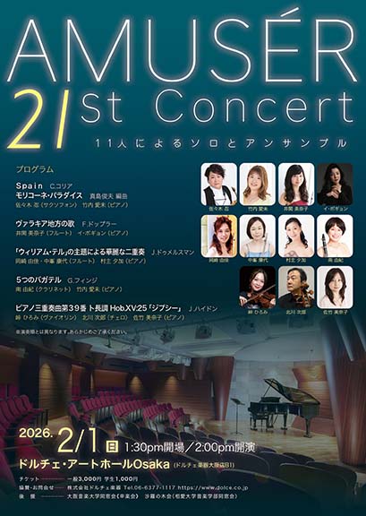AMUSÉR 21st Concert 開始: 2026年 2月 1日 2:00 PM 会場: ドルチェ・アートホールOsaka カテゴリ: 後援演奏会 入場料: 一般3,000円 学生1,000円 お問い合わせ: 06-6377-1117 開場13:30 開演14:00 会場 ドルチェ・アートホールOsaka (ドルチェ楽器大阪店B1) 〒530-0013 大阪府大阪市北区茶屋町1-1共信梅田ビル9F https://www.dolce.co.jp/salon/osaka/ https://www.dolce.co.jp/store/osaka/#access