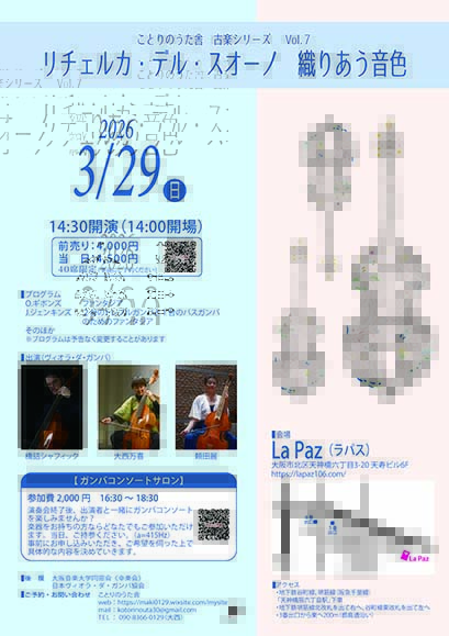 ことりのうた舎 古楽シリーズ Vol.7 リチェルカ・デル・スオーノ 織りあう音色 開始: 2026年 3月 29日 2:30 PM カテゴリ: 後援演奏会 入場料: 前売り:4,000円 当日:4,500円 お問い合わせ: 090-8366-0129 開場14:00 開演14:30 会場 La Paz (ラパス) 大阪市北区天神橋六丁目3-20 天寿ビル6F https://lapaz106.com https://lapaz106.com/access/