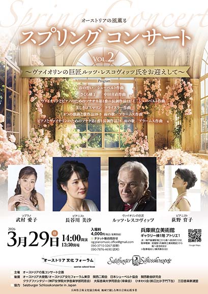 オーストリアの風薫る スプリングコンサート VOL. 2 〜ヴァイオリンの巨匠ルッツ・レスコヴィッツ氏をお迎えして〜 開始: 2026年 3月 29日 2:00 PM 会場: 兵庫県立美術館 ギャラリー棟1階アトリエ1 カテゴリ: 後援演奏会 入場料: 4,000円(税込/全席自由) お問い合わせ: 090-3710-3267(荻野) 090-7876-4690(武村) 開場13:30 開演14:00 会場 兵庫県立美術館 ギャラリー棟1階 アトリエ1 〒651-0073 神戸市中央区脇浜海岸通1-1-1(HAT神戸内) https://www.artm.pref.hyogo.jp https://www.artm.pref.hyogo.jp/access_m/