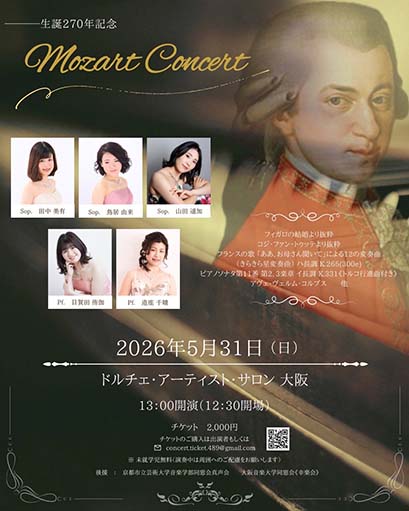 生誕270年記念 Mozart Concert 開始: 2026年 5月 31日 1:00 PM カテゴリ: 後援演奏会 入場料: 2,000円 開場12:30 開演13:00 お問い合わせ concert.ticket.489@gmail.com 会場 ドルチェ・アーティスト・サロン 大阪 〒530-0013 大阪府大阪市北区茶屋町1-1共信梅田ビル9F https://www.dolce.co.jp/salon/osaka/ https://www.dolce.co.jp/store/osaka/#access